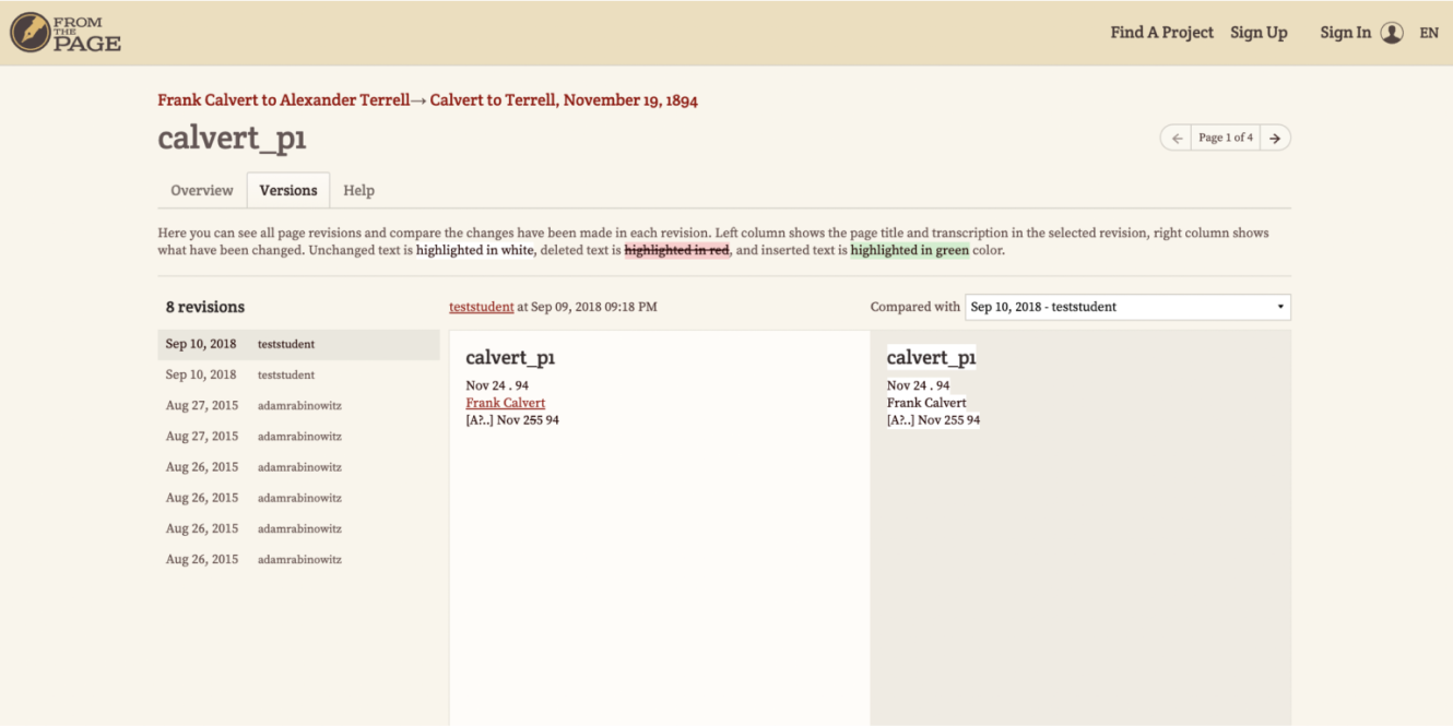 Adam Rabinowitz, a Classics Professor at the University of Texas at Austin, uses FromThePage as a teaching tool in an undergraduate course. Each student is assigned to find the primary source materials in the archive and transcribe a letter in the collection using FromThePage. Then a larger collection of transcribed letters are provided to write a paper. Read more on Adam’s use of transcription for pedagogy here.