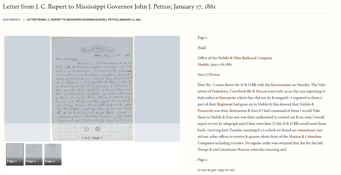 University of Southern Mississippi is transcribing, and annotating 20,000 digitized documents from the governor’s papers from the Civil War through the Reconstruction era. Transcription of letters to the governor provides a view of people experiencing this contentious time regardless of class, gender, race, religion, nativity, and age; traditional sources cannot provide access to that diversity. The collection includes lesson plans to help secondary educators incorporate these diverse nineteenth-century collections into classrooms. Discover more here.