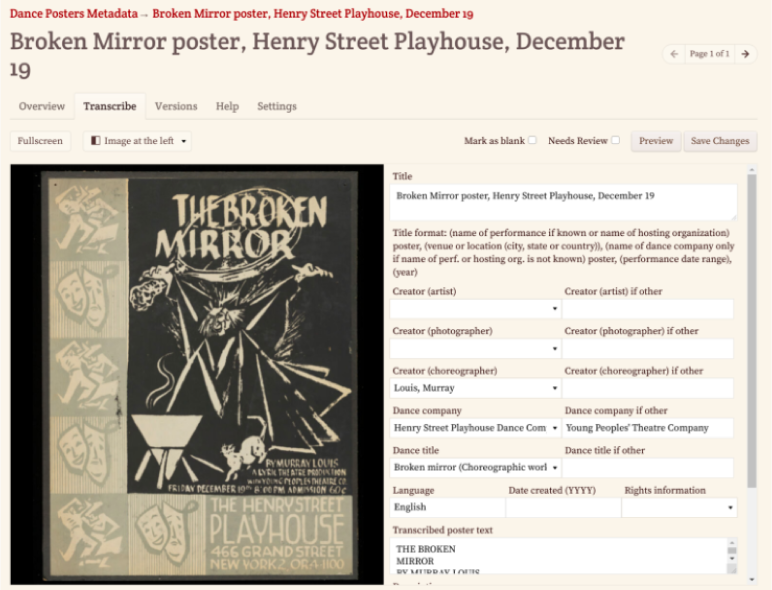 Ohio University Libraries uses FromThePage to generate transcriptions and descriptive metadata for dance posters in their collection. This project is a hybrid project, transcriptions are generated along with text from the posters captured through standardized metadata fields. This allows more accessibility and findability by users, also allowing discovery of related posters based on the standardized fields. See examples of how to capture metadata for your collection here.