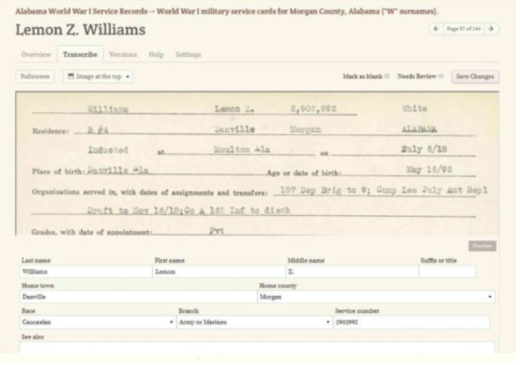 The Alabama Department of Archives and History staff spent 18 months digitizing 111,000 WWI service record cards and in only 3.5 months volunteer transcribers finished them all. FromThePage made it easy to keep track of all the volunteers, many who were not even in Alabama. People were looking for worthwhile projects, and the geographic boundaries of the documents mattered way less than staff thought they would. When this project was done the virtual volunteers were clamoring for more and the archives went to work getting more digitized collections up on the platform. See the whole story here.