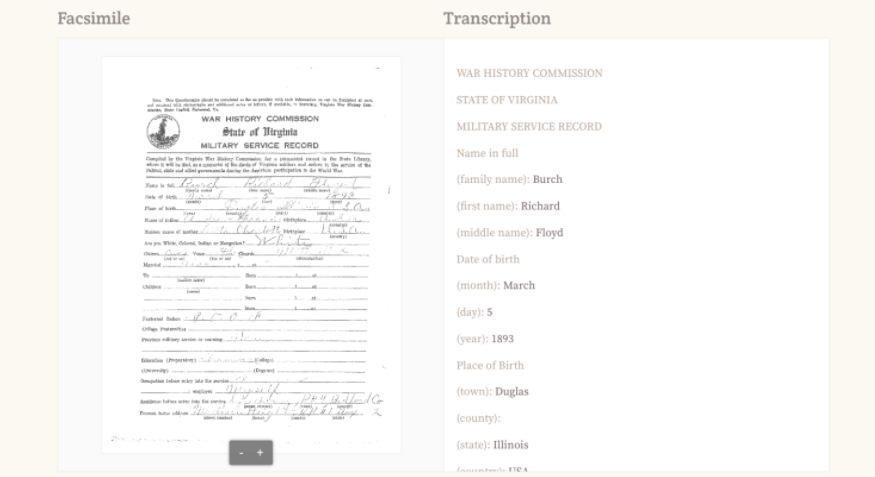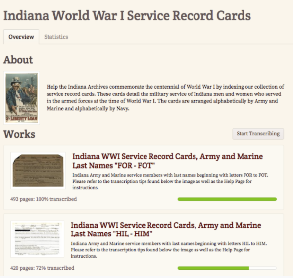 The Indiana Archives and Records Administration used FromThePage to create an index of Indiana’s WWI service record cards with the goal of honoring veterans and making history more accessible. Interest in transcribing records made it a very efficient way to index a large collection and illustrate the value of the archives to more people. FromThePage is a valuable platform for helping to make that connection happen. Read what volunteers have to say about the transcription process here.
